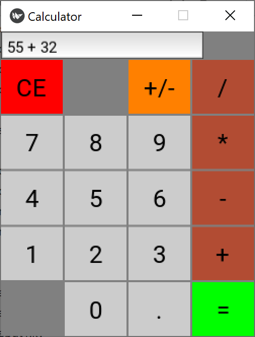 We were able to build this app quite quickly in part, because we had already written one for tkinter and was able to reuse some of the ideas. For example, all of the grey keys all use the same click event to copy the key label into the text input field at the top. This also applies to the brown math function keys, since rather than parsing the data, we decided to simply use Python’s calc function to evaluate the expression.